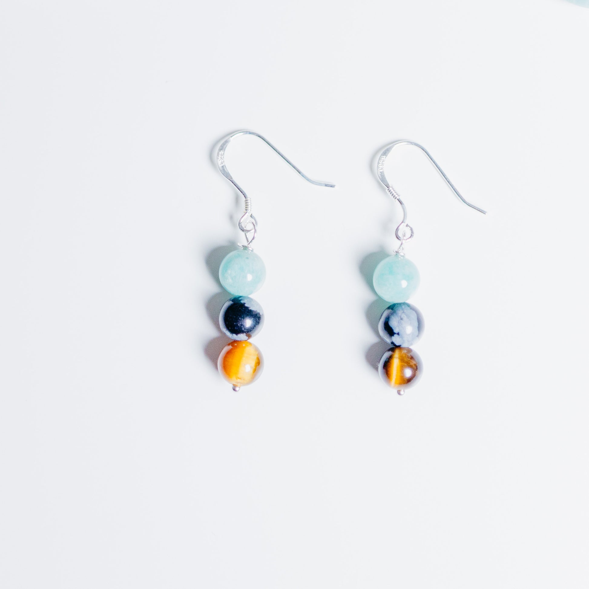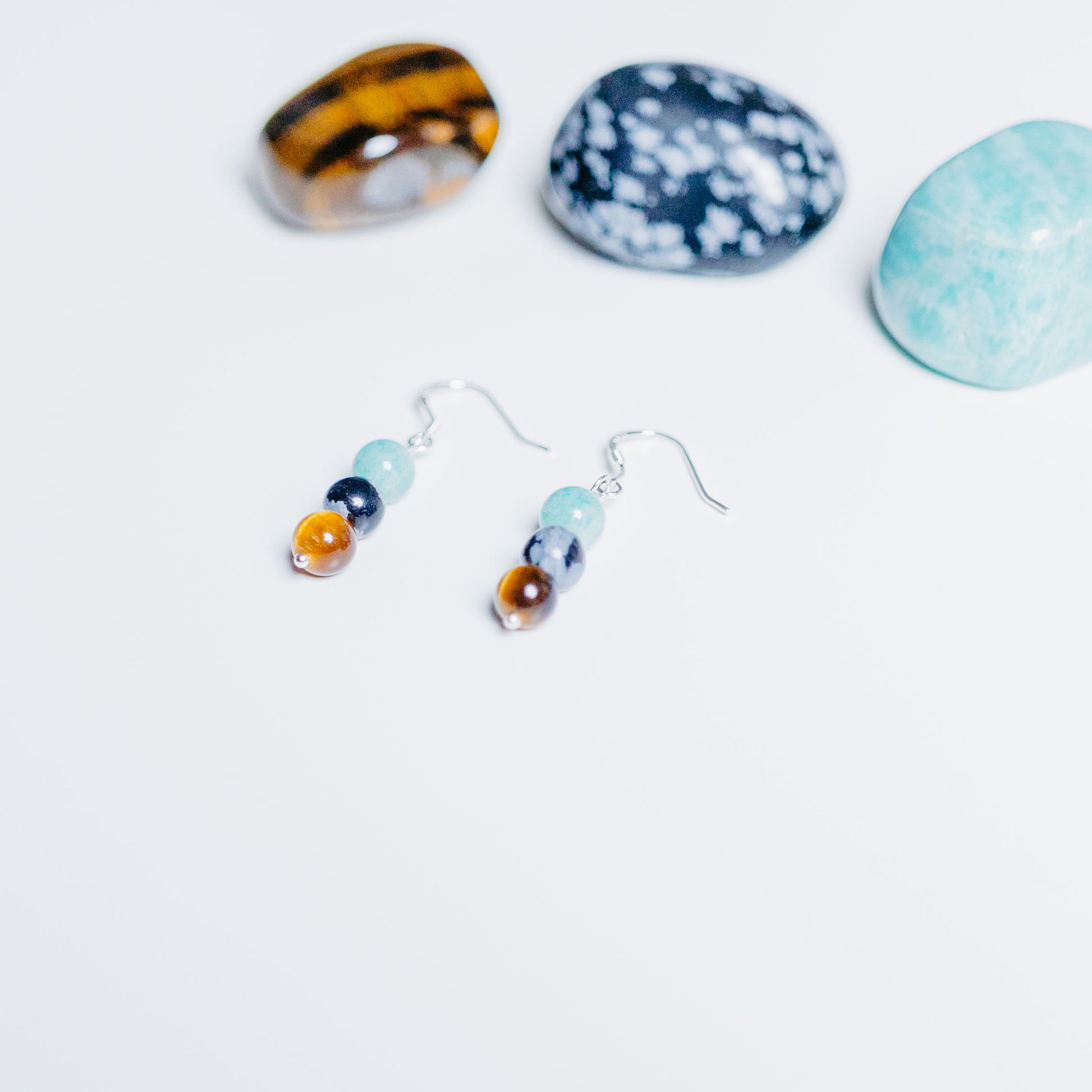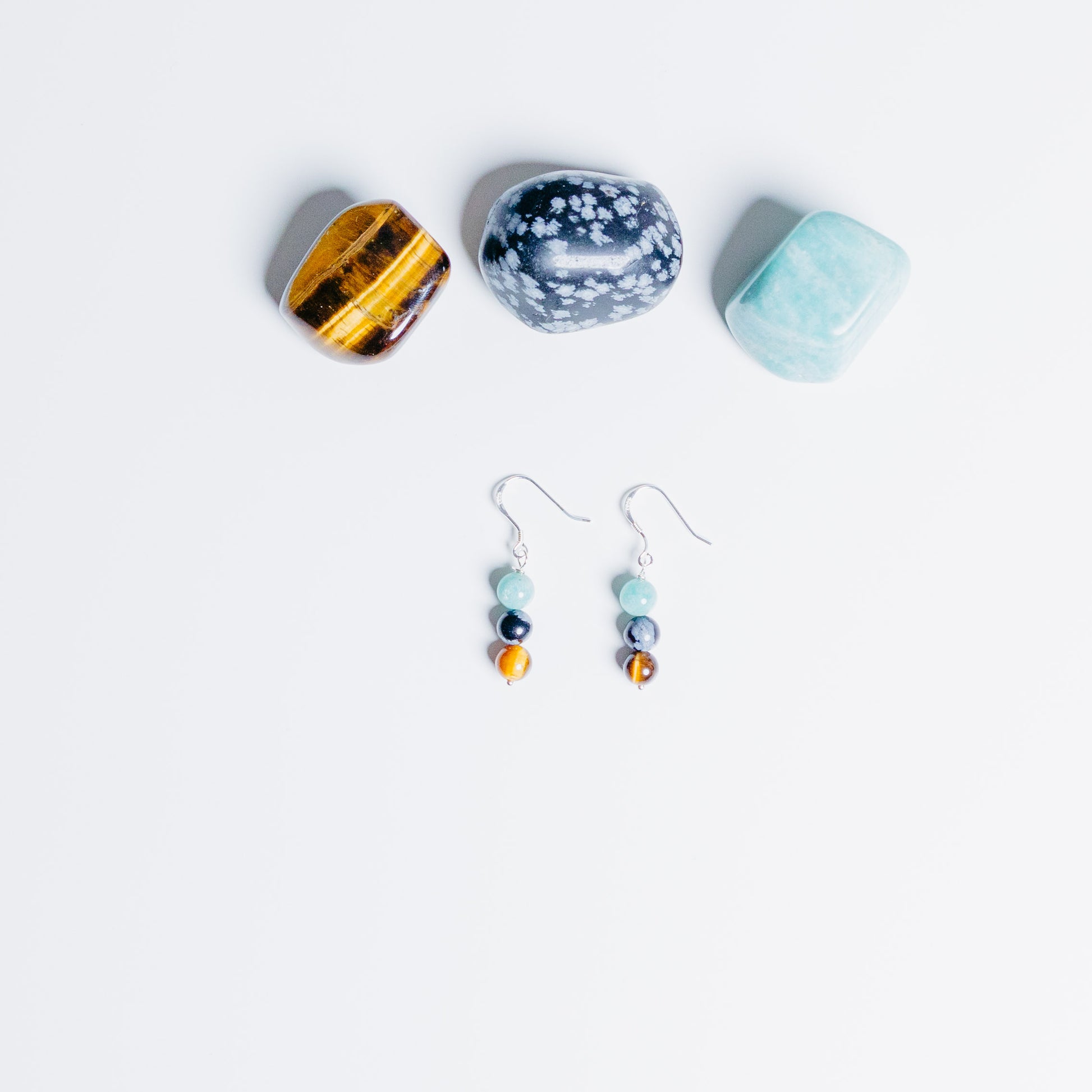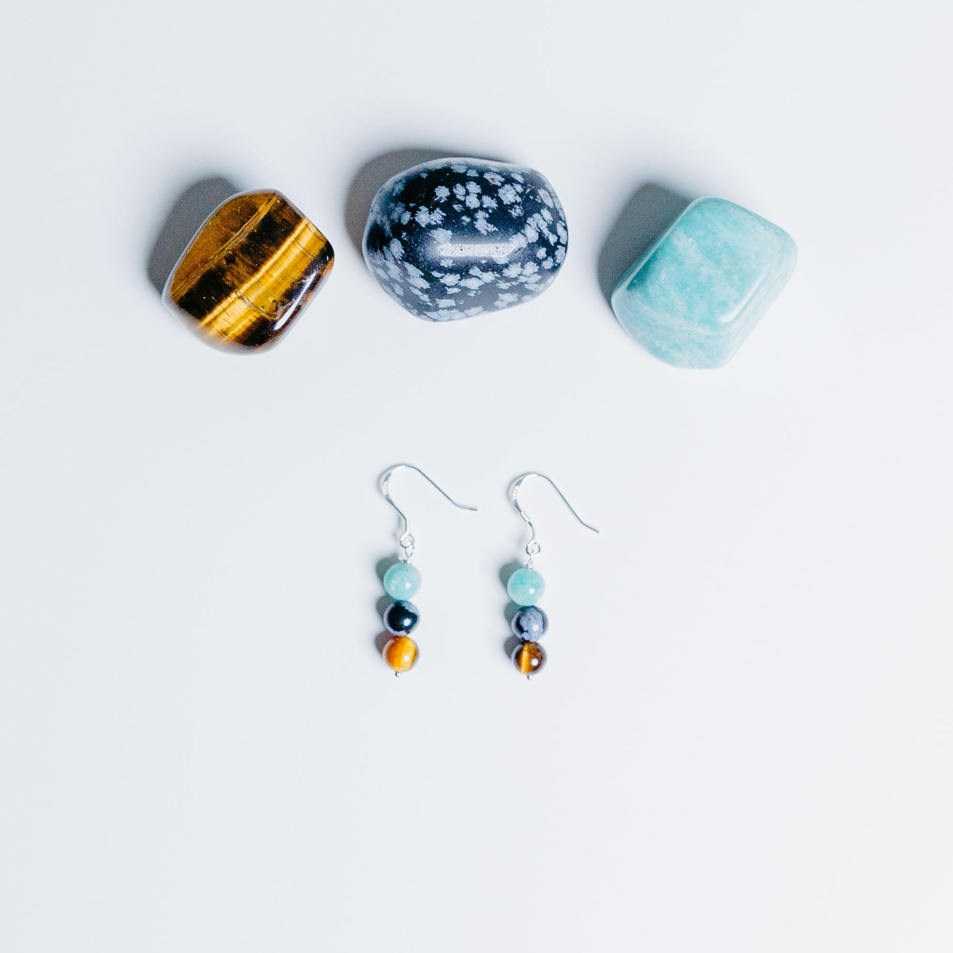 Steine: Amazonit, Tiegerauge & Schneeflockenobsidian *